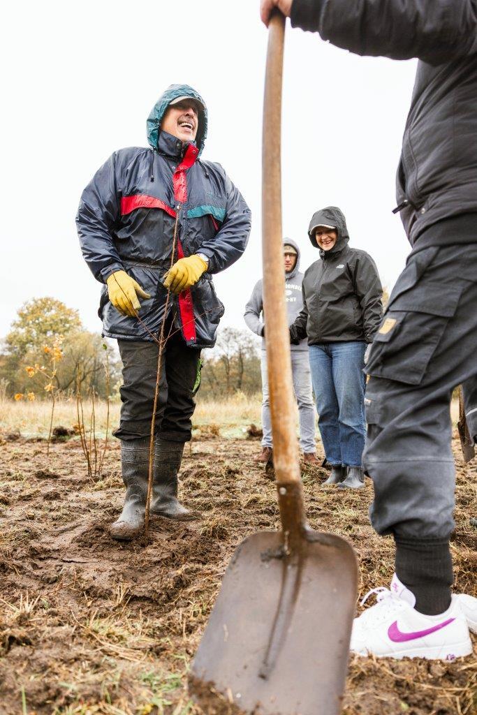 Die Helfer mussten ihr Bäumchen nur ins Loch stellen, mit dem Schuh die Erde hineinschieben, festtreten – fertig.